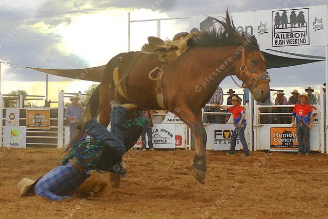 FACEPLANT: A rider faceplants in the middle of the arena after losing the battle against a bucking bronc. (PIC: PHIL WILLIAMS)