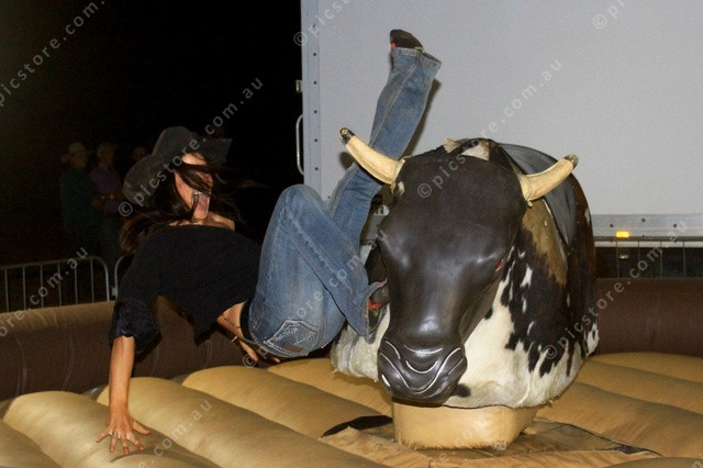 THROWN: Bree Fogarty gets thrown off Aileron’s mechanical bull. (PIC: PHIL WILLIAMS)