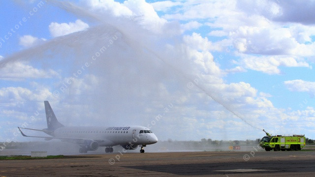 SPRAY: The first flight from Cairns to Alice Springs is given a water canon salute as it taxis to the terminal. (PIC: PHIL WILLIAMS)