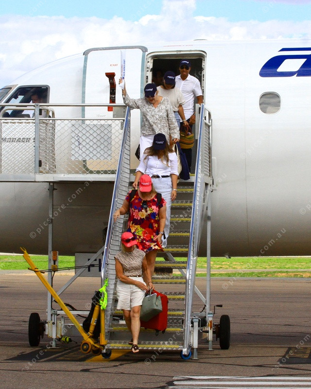 FIRST: The first passengers to disembark from the Cairns to Alice Springs flight in five years about to set foot in Central Australia. (PIC: PHIL WILLIAMS)