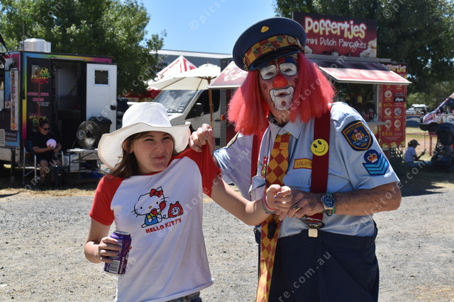 Kelly Barlow gets stopped by Lollipop the Clown at the 2026 Allora Show. (Jeremy Cook: 533561)