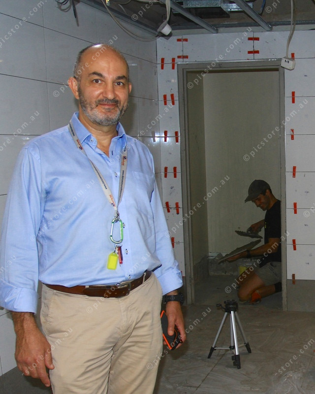 TILING: Eli Melky checks on new tiling work in a wet area during the Alice Plaza upgrade. (PIC: PHIL WILLIAMS 469998_03)