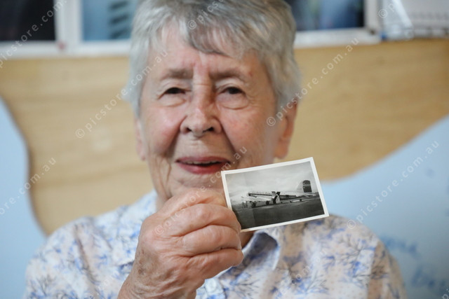Dorothy Dean with her photo of the Ansett Plane that flew from Essendon Airport to Hamilton in 1956.
