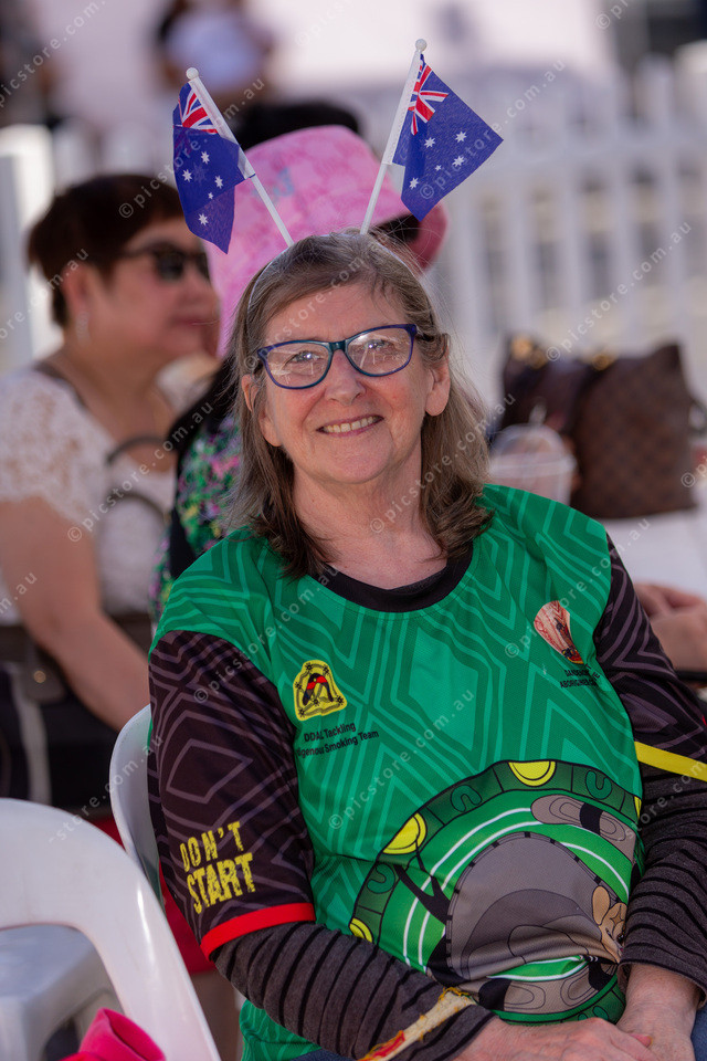 Pat Cross from Dandenong watching the entertainment on the main stage. Sporting a pair of Aussie Flags.
