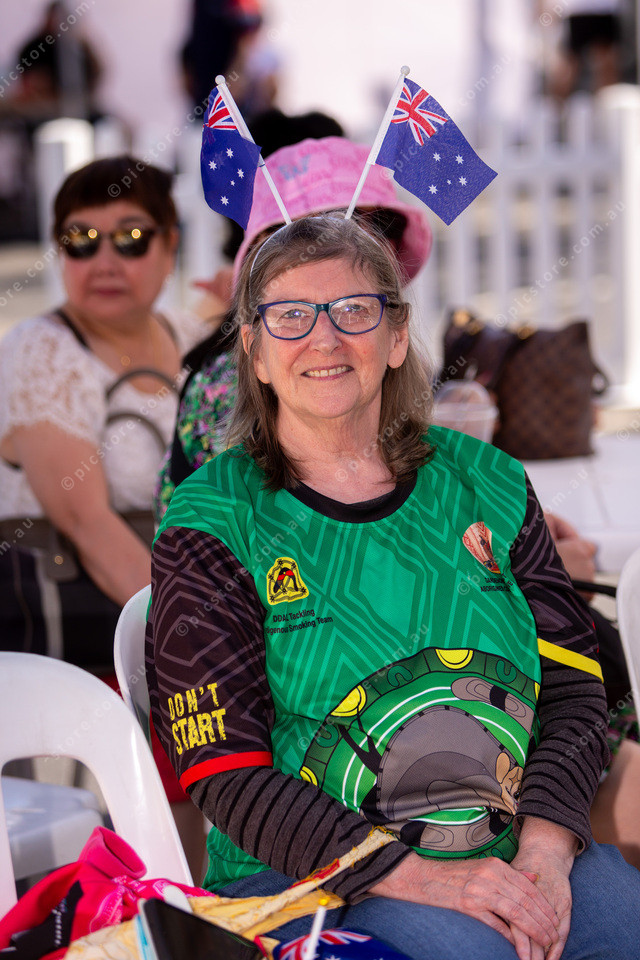 Pat Cross from Dandenong watching the entertainment on the main stage. Sporting a pair of Aussie Flags.