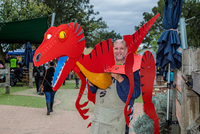 Fossil Phil a volunteer at Myuna Farm with his Velociraptor.