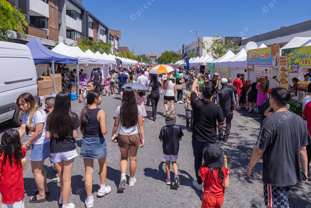 Crowded Buckingham Ave and stall holders.