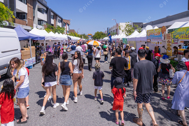 Crowded Buckingham Ave and stall holders.