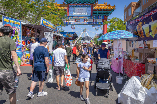Crowded Buckingham Ave and stall holders.