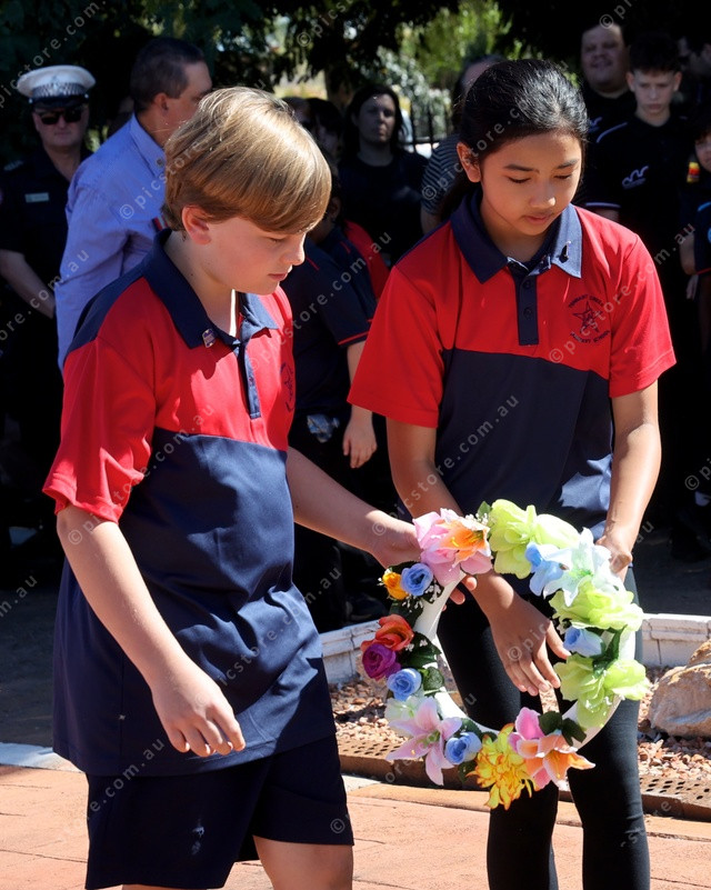 STUDENTS: Tennant Creek Primary School students prepare to lay their wreath on ANZAC Day. (PIC: HELEN KEMP)