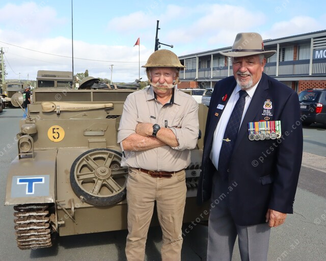 John Kratzmann and David Piggott from Murgon RSL, Parade Marshal stand in front of a 1942 Brengun Carrier. 474229_05