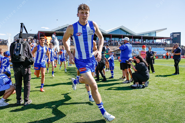 North Melbourne full forward Nick Larkey leads the Kangaroos onto the field for the first ever AFL game in the Barossa Valley. (Mark Willoughby: 471971_03)