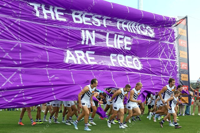 Fremantle run through the banner for Sunday’s Gather Round fixture against Richmond. (471971_09)