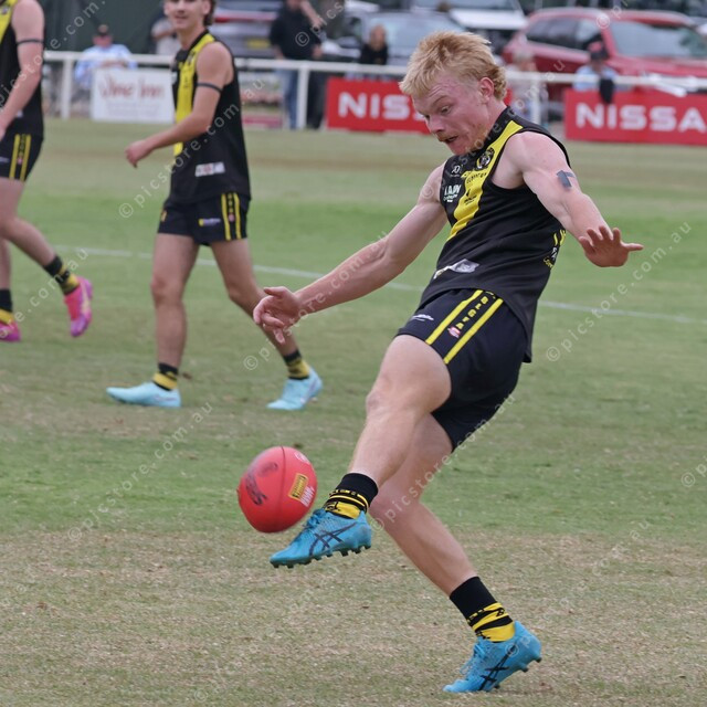 Standout recruit Mason Feltus sinks his left boot into the footy to clear the area. (474582_03)