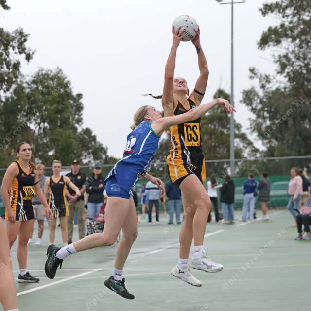 Nuriootpa’s Tahlia Hallett claims the high pass strongly as Rebecca Higgins tries to break it up. (Michael Slattery: 474480_03)