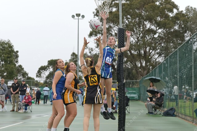 Angaston’s Rebecca Higgins skies to contest Alanah Radke’s shot. (474480_07)