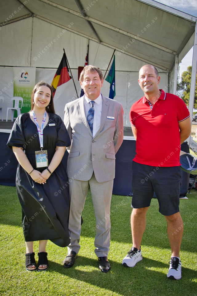 Special Guest Australia Day Ambassador and 2024 South Australian Young Citizen of the Year Alexandra Seal, Adelaide Plains Council Mayor Mark Wasley and chief executive James Miller. 455925_01