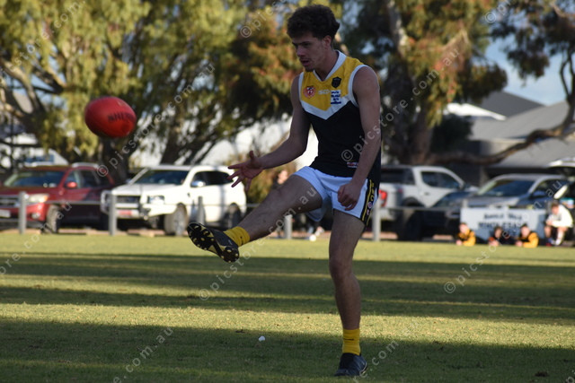 Angle Vale’s Jamahson Davies kicks towards the forward 50. (487150)