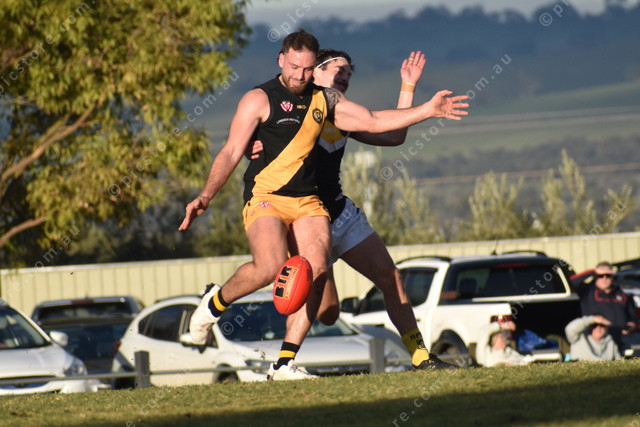 United’s Domenic Pratico about to kick as Angle Vale’s Jay Rathmann. (487150)