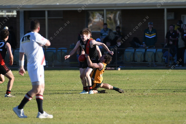 Pecker Thomas Michael hangs onto Bomber Angus Judd. (494057)