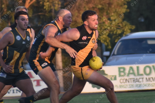 United’s Brodie Geisler is tackled by Balaklava’s Lachlan Michael. (477241)