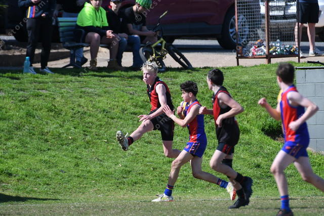 Riley Koch boots a goal for the Bombers. (Lisa Schulz: 498459)