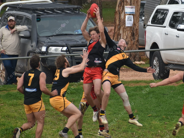 Hamley Bridge’s Zac Fairlie takes the mark near the boundary against United’s Josh Dunstone. (491030)