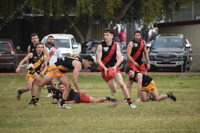 With his hands on the ball, tapped to him by teammate Josh Rosenzweig, Hamley Bridge skipper Angus Judd dashes from the contest. (491030)