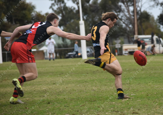 United’s Austen Perris about the clear the ball, out of reach of Hamley Bridge’s Matthew Taylor. (491030)