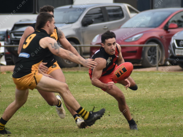 Hamley Bridge’s Kylan Bishop gets the contested handball against United’s Kobi Russell. (491030)