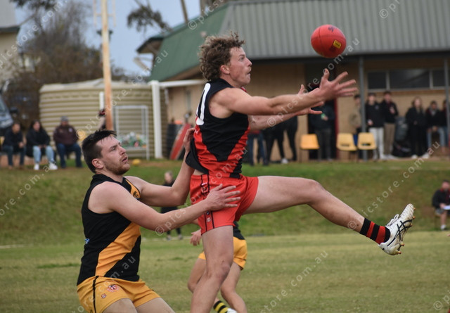 Hamley Bridge’s Zac Fairlie takes the mark in front of United’s Josh Weatherley. (Jarrad Delaney: 491030)