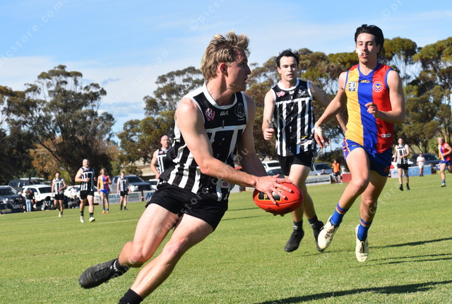 Mallala’s Jesse Trevor tries to manoeuvre the ball down the wing as Eagle Archie Yelland looks to cut him off. (503283)