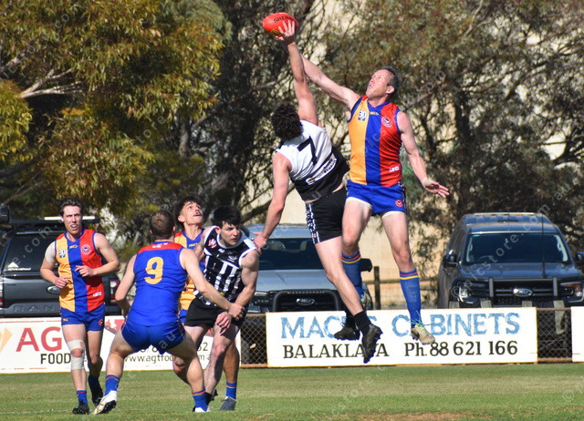 Mallala’s Kale Olds and Hummocks-Watchman Eagles’ Shaun Light contest the ruck in the A Grade preliminary final. (503283)