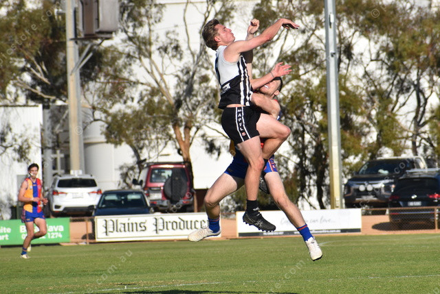 Mallala’s Jesse Trevor and Eagles’ Jaiden Jude collide in midair. (503283)