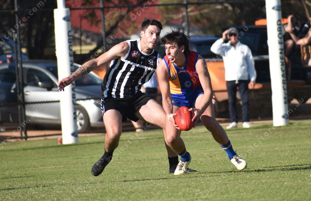 Eagle Archie Yelland finds himself about to be tackled by Mallala’s Toby Maughan. (503283)