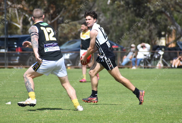 Mallala’s Asha Mead looks downfield for an option to move the ball forward, as Angle Vale’s Craig Street closes in. (503283)