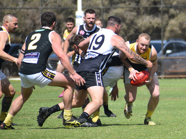 Angle Vale’s Matthew Stewart runs into the tackle of Mallala’s Jaden Redpath. (503283)