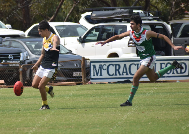Angle Vale’s Oliver Dodd kicks towards goal in front of a chasing Francesco Musolino. (503283)