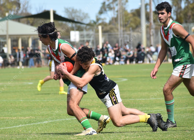 Angle Vale’s Giuseppe Tedesco lays the tackle on Chase Harris. (503283)