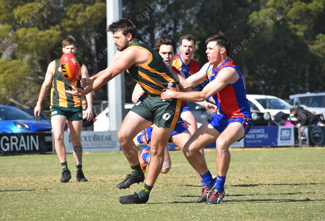 Balaklava’s Jarrod Miller handballs as he is tackled by Eagles’ Tait Nottle. (499747)