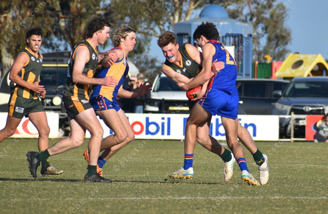 Pecker Lachlan Hendry runs into the tackle from Eagle Cody Duncan. (499747)