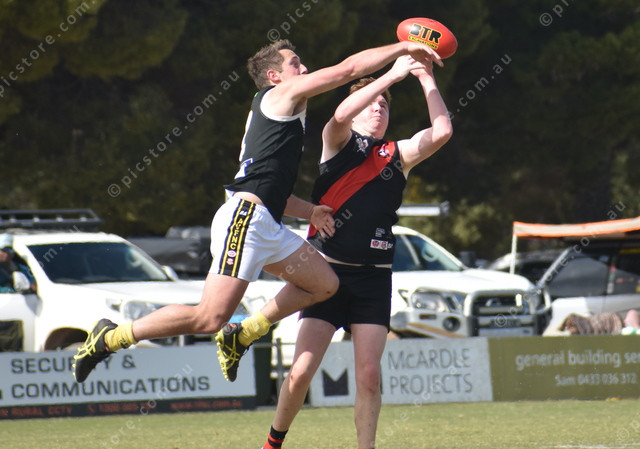 Angle Vale’s Jayden Fechner spoils the mark for Hamley Bridge’s Jayden Mullan. (499747)