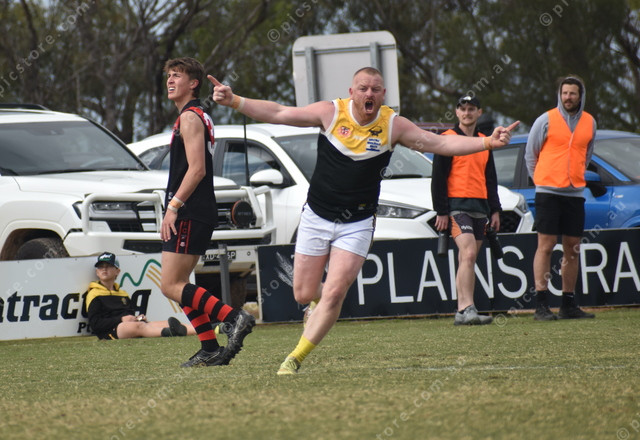 Matthew Stewart celebrates after kicking a vital goal for Angle Vale. (499747)
