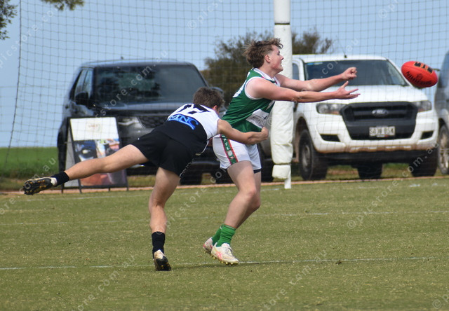 Virginia’s Reece Knevitt handballs as he is tackled by Mallala’s Lucas Pratt. (499747)