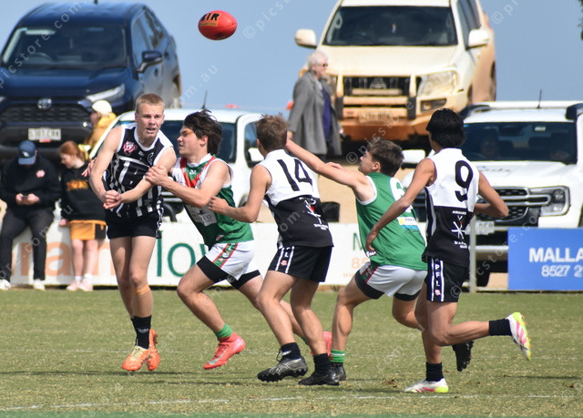 Mallala’s Khyan Carpenter handballs towards teammate Kai Winning. (499747)