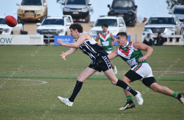 Mallala’s Ignatius Kain handballs as he is pursued by Virginia’s Mohammed Baltagie. (499747)