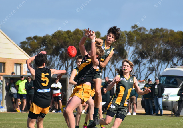 Balaklava’s Ash-Lee Oliver spoils the ball against Jack Pym. (499747)