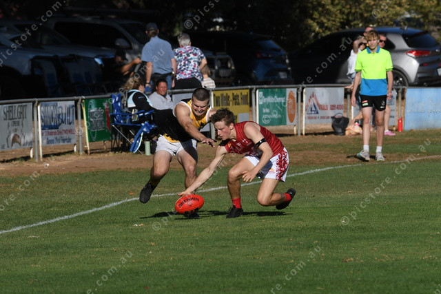 Owl Blake Pasin and Rooster Jamie Humphrys tussle for the footy on the boundary. (Lisa Schulz: 474725)
