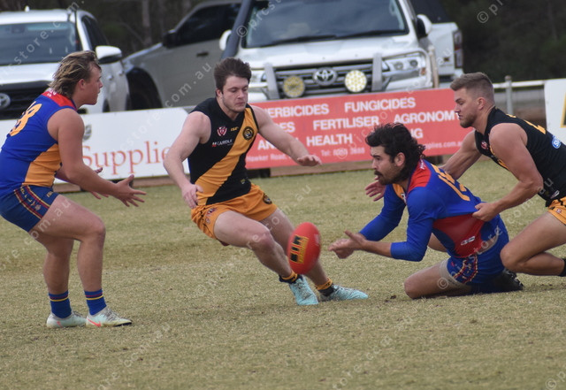 Hummocks-Watchman Eagles skipper James Daly handballs under pressure towards teammate Harley Peucker with Tiger Tyler Sobey attempting to intercept. (492473)