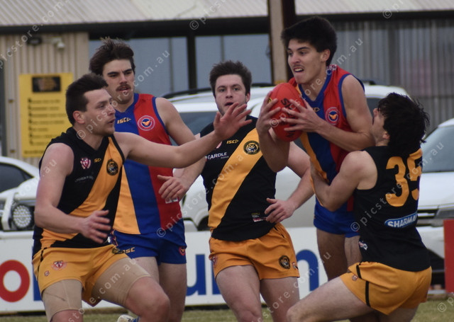 Eagle Cody Duncan is wrapped up by Tiger Isaac Pepe, as Josh Weatherley also closes in for the tackle. (492473)